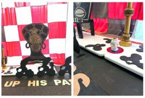 Once conceived in La Playa de Ponce, Cumbre Afro: The Negro Digs Up His Past moved to El Barrio in New York City, where the urban energy of the area provoked deep reflection. El Barrio’s metaphors of displacement, the reaffirmation of culture, and the mystical presence of Afro-descendant spiritual traditions all contributed to the spiritual synthesis that shaped the final altar. The installation integrates found objects and popular cultural symbols from the surrounding environment, including statuettes of Las Siete Potencias de La Madama and Elegüa, which are significant spiritual symbols in Afro-Caribbean traditions.